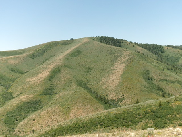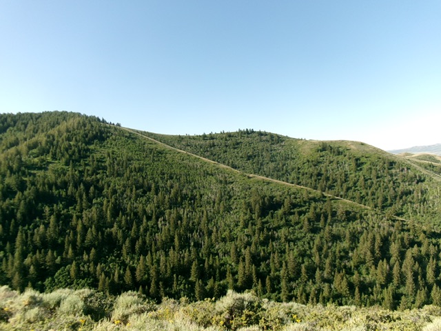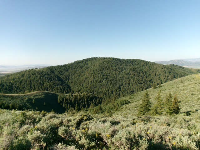 The LOJ placement of the high point is wrong. The summit cap (7280+) is a vast area of both pine forest and open, thick sagebrush. The old 2-track roads that I found up on the summit cap come up the west ridge and the northeast gully.