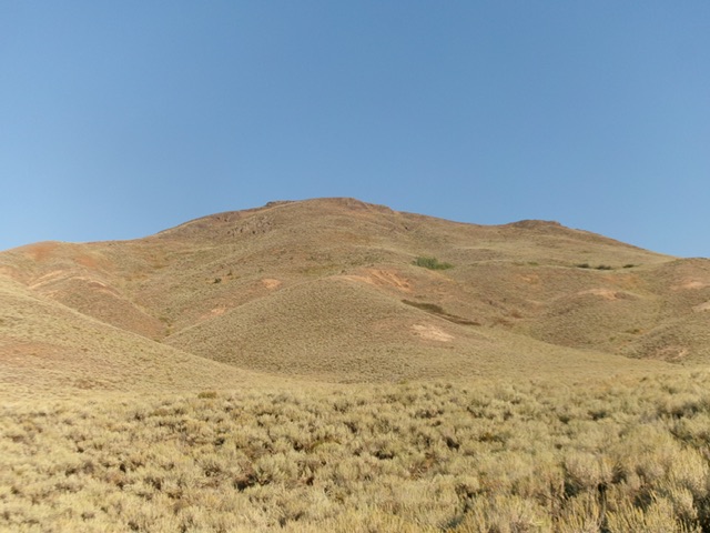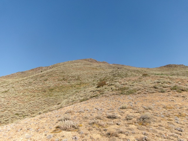 Leave the gulch and bushwhack northwest up the obvious shoulder. This bushwhack is thick and unpleasant (sagebrush and other scrub) initially but the shoulder opens up and is easier scrub. There are also some open sections of scree/gravel. Higher up, the shoulder steepens considerably and changes back to thick sagebrush and scrub but has some weak gaps and game trails in it.