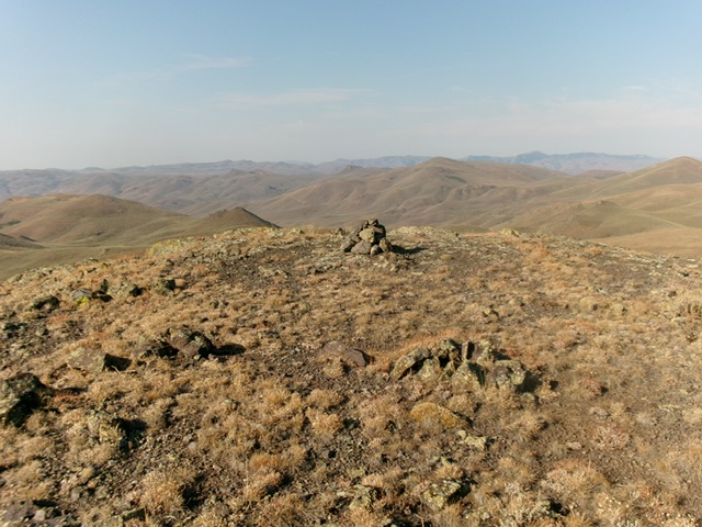 High up, the shoulder becomes mostly a scree/gravel scramble with gapped, short scrub. It is not difficult or too loose. Work back-and-forth to keep the steep terrain manageable. Reach the top of the shoulder and pop out on the summit ridge about 70 yards northeast of the cairned high point. Head left/southwest to the top. The summit has triangulation wiring and a few small cairns. I built a new cairn on the highest point, a ground boulder about 15 feet from the triangulation cairns.