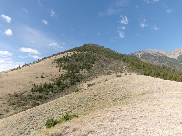 Peak 7415 as viewed from the northeast (start of climb). The forested summit hump is right of center. Livingston Douglas Photo