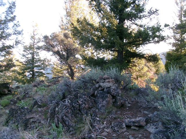 From the road saddle, bushwhack directly north then north-northeast up the pine, brush, and talus ridge (with cut tree stumps early on). The ridge gets much rockier and steeper as you advance higher. Scramble up a very steep section of boulders/talus and sagebrush (Class 3) to reach a rocky point. From there, drop 10-15 feet into a pine forest and continue up to a higher rocky ridge point (partially forested).