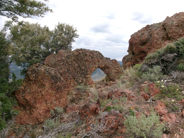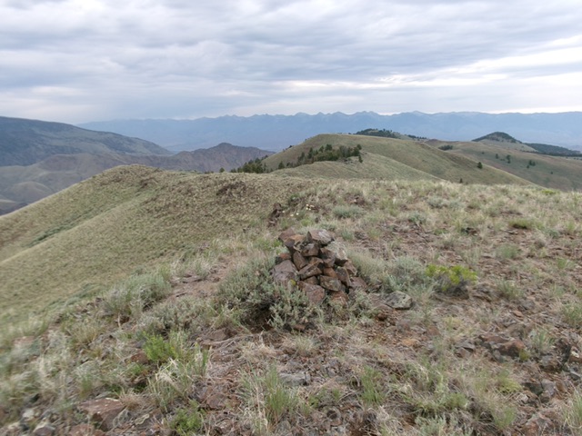 After passing the rocky section of the west face, leave the road and scramble east up a grassy shoulder to reach the steeper east face higher up. The east face is steep grass and loose gravel, but there are diagonal game trails to assist in this climb. The underlying gravel is a bit loose high up, especially on the descent. Aim for just right/south of a block of ridge rock to get up onto the south ridge. A short scramble left/north leads to the high point. There was no summit cairn so I built a nice one.