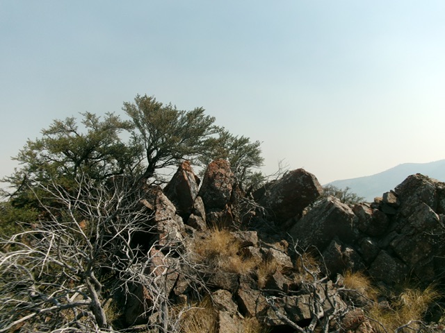 The final right/west push to the high point is the crux and is a mix of rocky outcrops and thick mountain mahogany (Class 3). You can avoid this section by leaving the ridge below this point and angling left/west through the forest to reach the north side of the summit (Class 2). The high point of Peak 7630 is a few boulders with mountain mahogany mixed in. The highest boulder has mountain mahogany over it.