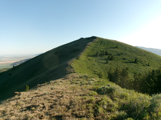 From the improvised campsite, walk about 50 feet up Stewart Canyon Road to find a lane/clearing through the trees to reach the steep south face of the southwest ridge quickly. Scramble up steep, loose scree/gravel and scrub with an old cattle fence nearby (initially) that heads up toward the ridge crest. Once on the ridge crest, the slope is much easier but the scrub is much thicker. Head northeast up the rounded, sagebrush ridge to reach open Point 6972.