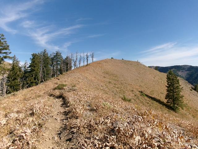 The trail skirts a few rocky ridge outcrops as it approaches the rounded, open summit hump of Peak 7978. The trail does not go to the summit. Instead, it moves off the ridge and follows the left/southwest side of the ridge to skirt the peak. Leave the trail where it begins to move away from the peak. Scramble right/east up easy scrub to reach the ridge crest. Follow the easy ridge for a short distance to the well-cairned summit.