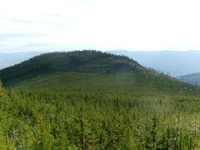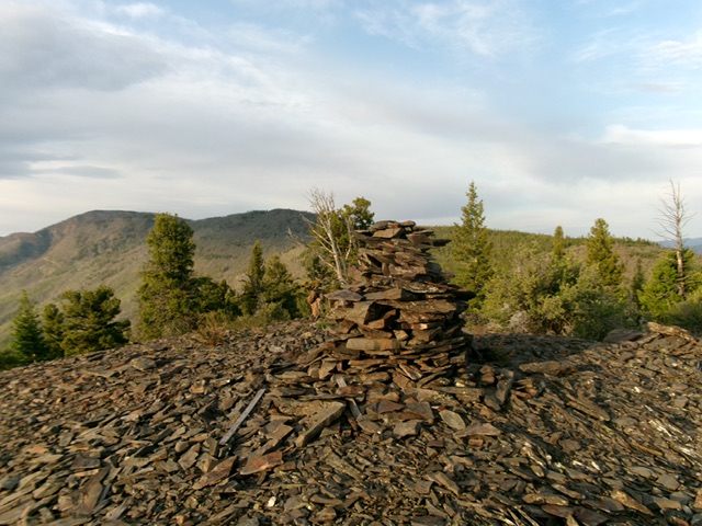 Leave the 2-track road and bushwhack northeast then north to the open summit of Peak 8069. The terrain on this ridge is always rocky underneath (talus/scree/boulders) and has rocky outcrops on its right/east side to skirt early on. There is an initial burn area with burnt logs on the ground and blowdown as well, which makes this section a bit tedious to bushwhack. The forest higher up is not too bad but has pesky underlying boulders and talus. The summit of Peak 8069 is open and has a large, tall cairn.