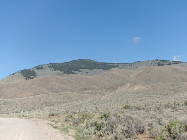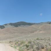 From the summit, descend briefly southeast then directly south to reach the easy, open scrub of the south shoulder. This descent route is on a lot of steep, loose scree with grass/scrub mixed in. There are trees/blowdown and some boulders to skirt on the way down. Once on the easy, broad shoulder (at just above 6,800 feet), follow it south. Bend a little right-ish/south-southwest as you near the road. Do a final drop to a gully then descend easy scrub and sagebrush to the road. Walk about 0.3 miles west up the road to the roadside pullout and your parked vehicle.