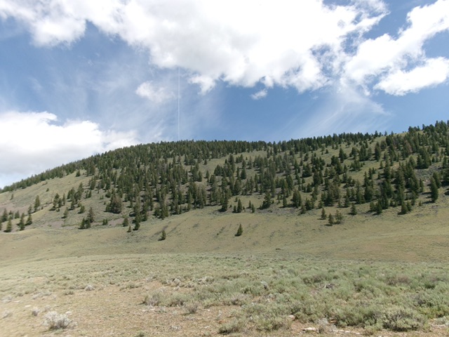 From ID-28 at virtual MM 113.9 (about two miles south of Tendoy), turn west onto [signed] McDevitt Creek Road/FSR-150 and reset your odometer. At 4.1 miles, reach the Salmon National Forest boundary. At 5.2 miles, reach a minor roadside pullout. Park here [5,766 feet; 44°55’26.7”N, 113°44’15.0”W].