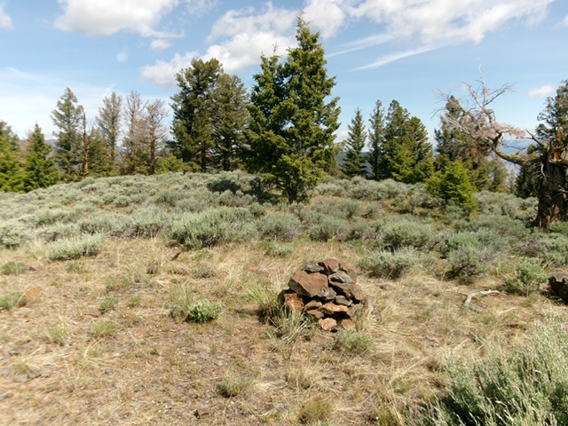 Scramble up the steep, loose scree/scrub/grass and scattered pines/blowdown on the south face, avoiding steep scree patches as much as possible. Stay in scrub or easy, steep forest to finally reach the summit ridge crest (southeast ridge) just below the open sagebrush summit hump. I rebuilt the torn-down summit cairn and enlarged it. The high point is in the open and all sides of it descend gradually away from it, as the USGS topo map indicates.