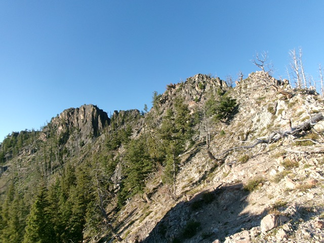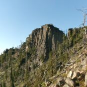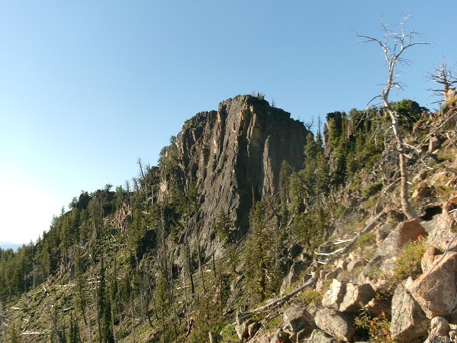 The west shoulder is steep and is a tedious mix of field grass, veg, downed logs, and some standing snags. This is a burn area. It requires a lot of weaving due to downed, charred tree logs. The scattered scree under the field grass is a loose, slipper mess when descending it. The north ridge is steep and is much rockier high up. Skirt several ridge towers/blocks on the right/west side to reach the summit blocks. Work around the first two blocks on their right/south side to reach the final massive block.