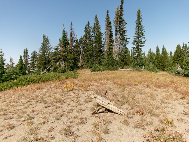 Once on the summit ridge, go right/east and stay in areas of easy, open scrub to reach the bare summit high point at the east end of the summit ridge. This is consistent with the measured high point on the USGS topo map. The ridge pines, mountain mahogany, and ridge willows are a bit of a headache and should be avoided. I built a wooden summit cairn on the high point. There were no loose rocks with which to built a standard summit cairn. I could not find a higher point than this open area at the east end but there are forested areas to the west along the summit ridge that are of similar height.