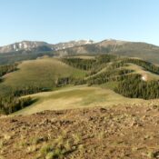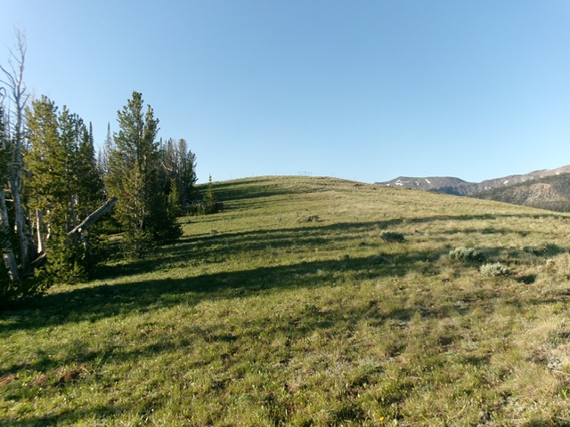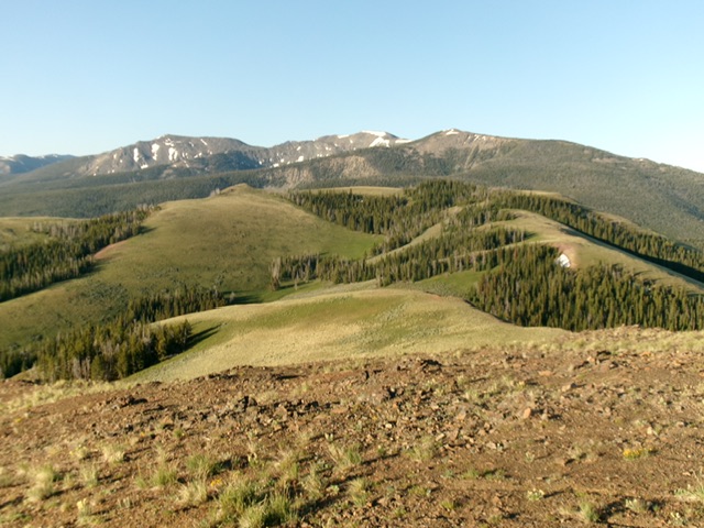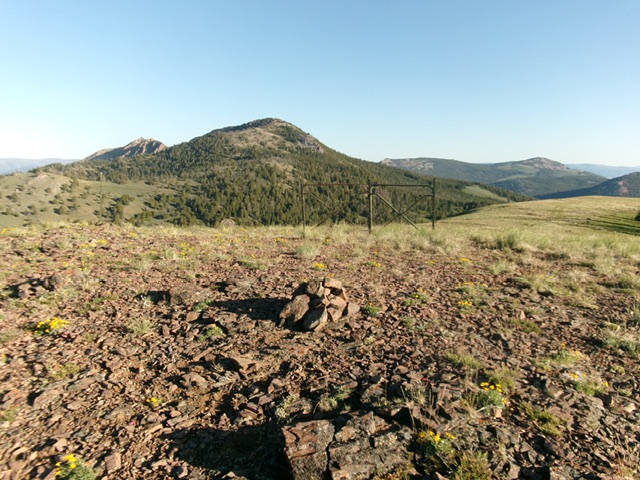 From the 8,340-foot connecting saddle with Watson Peak, head south to get through a minor finger of thick pine forest to reach/stay in open scrub. Head right/west-southwest to reach the ridge crest. Follow the ridge south then southwest, avoiding forested patches on or near the ridge, to reach the [lower] north summit. The ridge terrain is easy, short grass and scrub. From the north summit, continue a short distance south to the true/south summit. The summit hump is bare and has a fence row on it. I built a modest cairn on top.