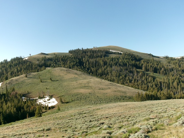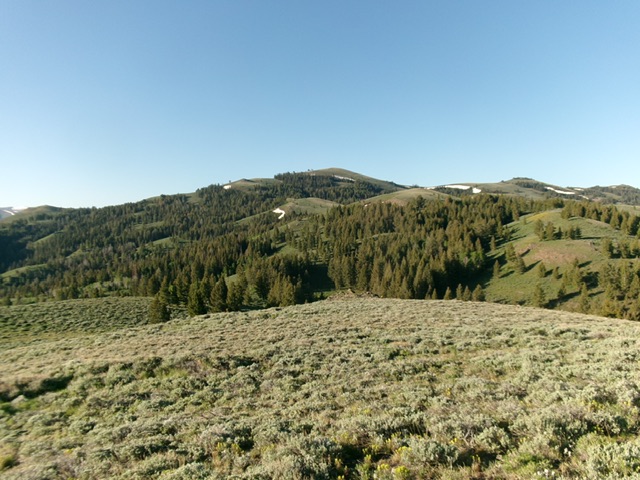 Follow this torturous ridge with its many twists/turns and ups/downs to Saddle #1, Saddle #2, Point 8015, Saddle #3, and Saddle #4. The ridge terrain is generally easy (short grass/scrub) and has elk trails in many areas. There is a short patch of easy pine forest above the minor saddle after Saddle #1. There is very little rock to deal with. The northeast spur ends at a ridge hump just before reaching Saddle #2.
