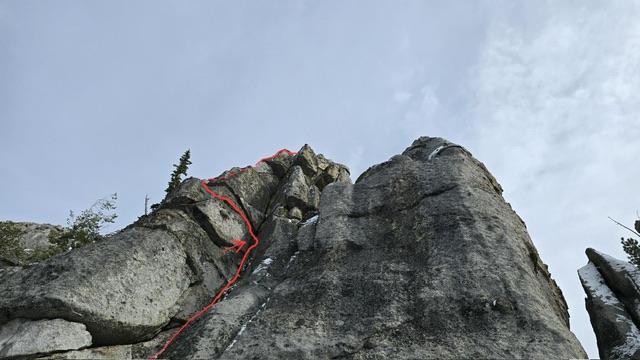 Ridge Baldner wrote a trip report and published it on peakbagger. He wrote in pertinent part “We made our way to the northern side of the high point and found a decent little ‘chute’ to scramble up. Once up on the rock, the high point is just a short walk back in a southern direction (A few Class 3 moves).” On October 10, 2025 Alex Feldman, Steve Grantham, Michael Pelton and I followed this advice to the peaks north ridge. We climbed up ridge via some easy bouldering on granite slabs. There is a register left by John Fredland in this area. The slabs top out on an exposed knife edge ridge which as Baldner correctly writes does lead to a high point. However, the high point is not the true summit. We followed the knife edge a short distance where we encountered high point separated from the true summit by a small notch. The true summit rises vertically out of the notch. Relying upon the Baldner ‘Class 3’ rating, we did not bring any technical gear. As you will see from the photo below, the tower is basically a short, but difficult, exposed bouldering problem with its difficulty increased by at least a 50-foot drop on three sides. Clearly, the summit tower is not Class 3 from this point. So we reversed our route and, without success, looked for another nontechnical route up the tower. The final climb of the summit block route looks is according to Laden Platt (as noted above) an exposed Class 5.2 climb.