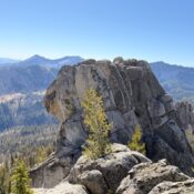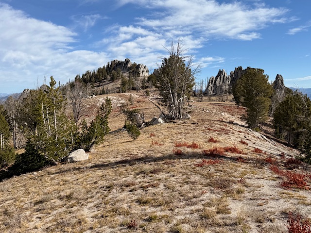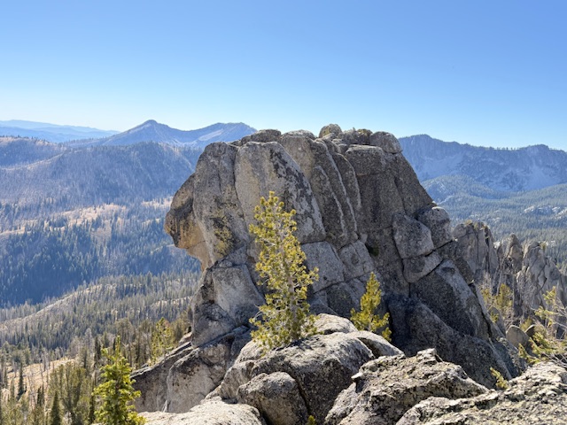 Ridge Baldner claimed the first ascent. He wrote a trip report and published it on peakbagger. Baldner wrote in pertinent part “We made our way to the northern side of the high point and found a decent little ‘chute’ to scramble up. Once up on the rock, the high point is just a short walk back in a southern direction (A few Class 3 moves).” On October 10, 2025 Alex Feldman, Steve Grantham, Michael Pelton and I followed this advice to the peaks north ridge. We climbed up ridge via some easy bouldering on granite slabs. There is a register left by John Fredland in this area. The slabs top out on an exposed knife edge ridge which as Baldner states leads to a high point. However, the high point is not the true summit. We followed the knife edge a short distance where we encountered high point separated from the true summit by a small notch. The true summit rises vertically out of the notch. We backtracked a short distance to a false summit. Derek Percoski evaluated the peak using LiDAR date and determined that “the southernmost tower (43.61990851,-115.41270428) is 2.5′ taller than the one 70′ to the north.” But I read your TR and it sounds like you didn’t have any doubts on which point was higher. Relying upon the Baldner ‘Class 3’ rating, we did not bring any technical gear. As you will see from the photo below, the tower is basically a short, but difficult, exposed bouldering problem with its difficulty increased by at least a 50-foot drop on three sides. Clearly, the summit tower is not Class 3. Therefore, I believe, based on Baldner’s description and the difficulty of the summit tower, that the peak has not been climbed. So we reversed our route and, without success, looked for another nontechnical route up the tower.