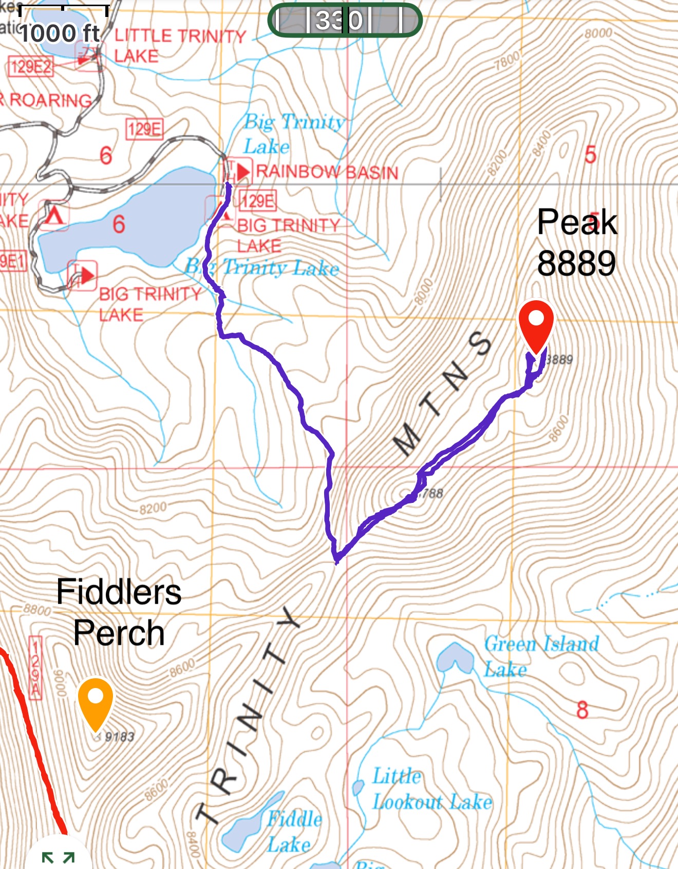 From the trailhead, follow a good trail to the saddle between Fiddlers Perch and Peak 8889. The first section of the trail goes through an old burn and, as a result, there will be some deadfall. Nevertheless, this is a good trail that reaches the saddle in roughly a mile. Leave the trail and climb north up the steep, broad ridge. Pass the first ridge bump on its east side. Once past the bump, the broad ridge is covered by beautiful meadows. You will soon have a view of the summit fin as well as other impressive outcrops. Note (1) that the USGS quad erroneously shows the trail beginning on the south side of the lake and (2) the most recent USFS map does not even show the trail.