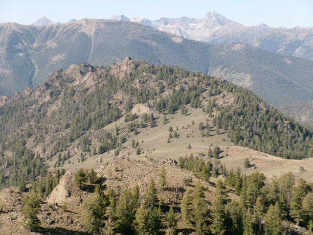 Peak 9268 (in mid-ground) as viewed from Peak 9380 to its northeast. The rugged north ridge (my ascent route) is right of center and center. The pointed summit hump is quite visible in this photo. Livingston Douglas Photo