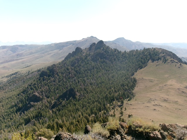 Peak 9380 and its forested west face as viewed from Peak 9292. The connecting saddle is right of center. This photo shows my descent route from Peak 9380. Livingston Douglas Photo