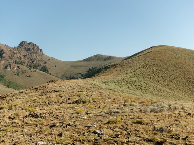 Peak 9380 (rocky outcrop left of center) as viewed from midway up the easy, sage-covered south ridge. This was the first leg of my ascent route. Livingston Douglas Photo