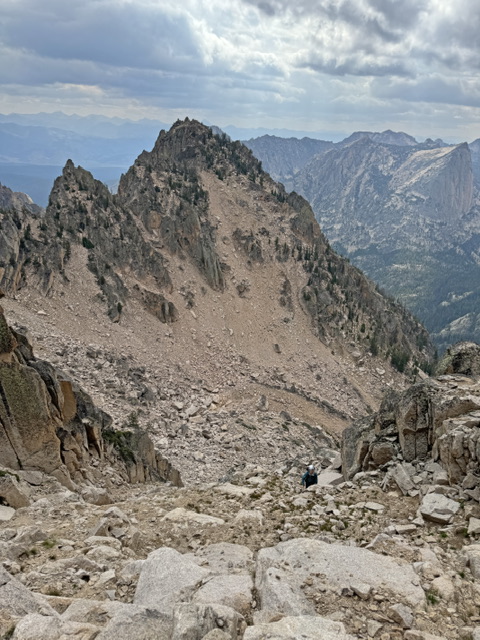 Leave the Redfish Creek trail, FST-101 [(A)(6)(b) Page 206] at 7300’ (44.07581, -114.99021) and make a steep bushwhack up to the 8900 unnamed lake. I’ve done this path several times and found it’s best to stay right. From the lake, head due north then ascend the most prominent couloir on the northeast face. There’s a bit of class-4 at the start, then the rest is class-3. Top out on the summit ridge.