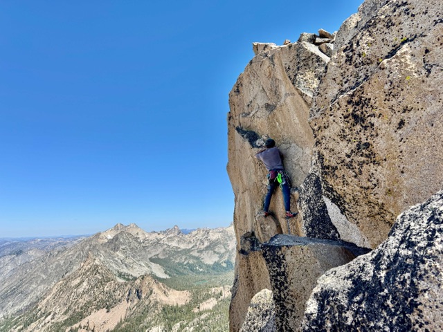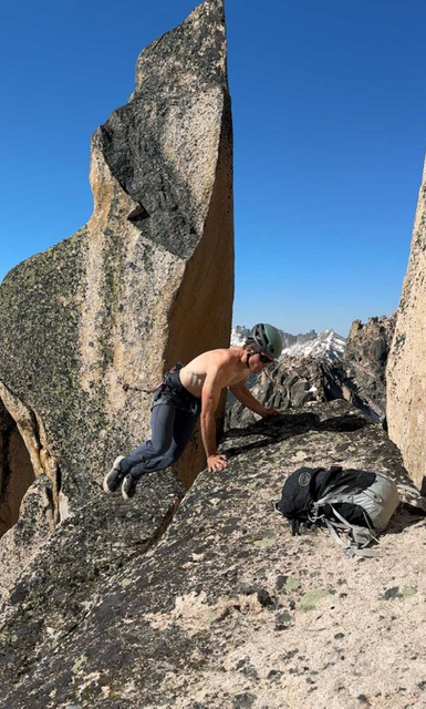 Once on the summit ridge look for a tunnel on the left for the easiest passage to the summit. Pitch 1 has multiple options. There’s a chimney you’ll see first, but beyond that is the fastest way up. You can mount a flake then make a “dyno mantle” over a gap. It’s possible to protect the mantle by throwing a rope over the back. The summit pitch generally only offers small cracks for pro. We brought and used two ball nuts. We used a 40m rope which was about the minimum needed for the second rappel.