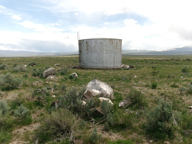 This climb is mostly Class 1. From the unsigned road junction, hike west up the 2-track road (with a 15-foot drop early on) to the water tank on the summit area. The high point seems to be some ground boulders just north of the water tank.