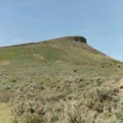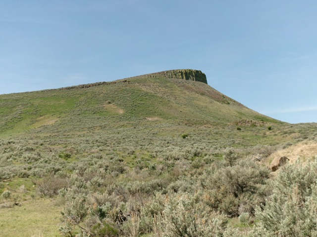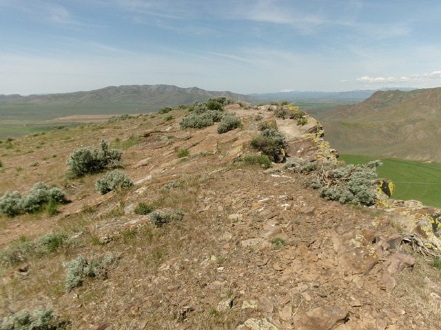Find a gap in the headwall near its right/northwest end at a large block. Once atop the headwall, scramble southwest in easier (less rocky) grass, scrub, and gravel. Ascend a steep-ish face/minor shoulder of thick-ish sagebrush to reach the open rock of the top of this beautiful butte. Head right/northwest to the open summit and high point. The primary USGS benchmark is gone but the secondary one remains in a ground boulder.