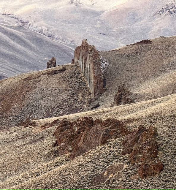 Rock of Ages is an impressive rocky protrusion that sits due east of Burnt Creek Road near the fork in the canyon. It is most easily climbed from Burnt Creek Road. Based on the USGS topo map and visual observation, Rock of Ages appears to require Class 5 climbing skills. There are no recorded ascents as of 2024. USGS Burnt Creek