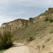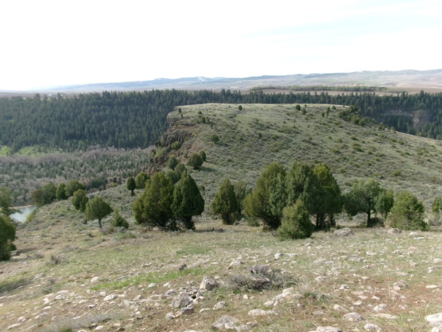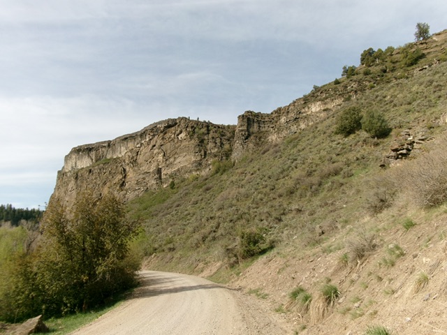 From US-26 northeast of Idaho Falls and east of Ririe, turn left/north onto the paved road that heads to the Kelly Mountain Ski Resort. Bear right at an unsigned “T” junction and continue east then left/north to cross the Snake River on a beautiful bridge. Once across the bridge, turn right/southeast onto [signed] Heise Road. Follow Heise Road along the Snake River to a signed junction with Kelly Canyon Road. This junction is 5.4 miles from US-26. Go straight to stay on Heise Road. Reset your odometer here. Drive 6.7 miles southeast then east then north on Heise Road (a rocky, bumpy, washboard road) to reach a nice roadside pullout just northeast of Table Rock. Park here[5,079 feet; 43°36’14”N, 111°34’34”W].