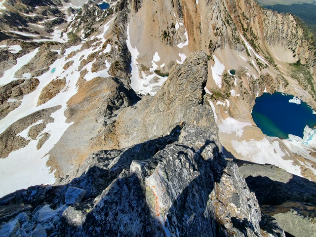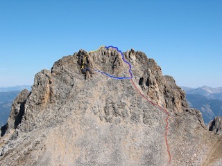 Blue route shows the connection from the chimney route to the main route. Yellow is the alternative of continuing on the N ridge. John Platt Photo