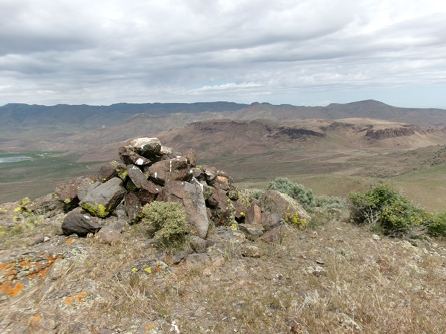 From the roadside pullout, cross to the east side of Reynolds Creek Road and bushwhack east up over a sagebrush ridge. Drop 20 vertical feet to cross a dry gully. Continue east up steeper sagebrush and up over a headwall of sorts to reach two ridge humps. Bend left-ish and cross the second hump. Descend almost 100 vertical feet east to a saddle and an ATV trail. Follow the ATV trail briefly east then leave it to bushwhack left-ish/northeast up through more sagebrush to reach a rocky point on the south ridge. Go left/north here and scramble along the rock-and-scrub ridge to reach the well-cairned summit of Windy Point.