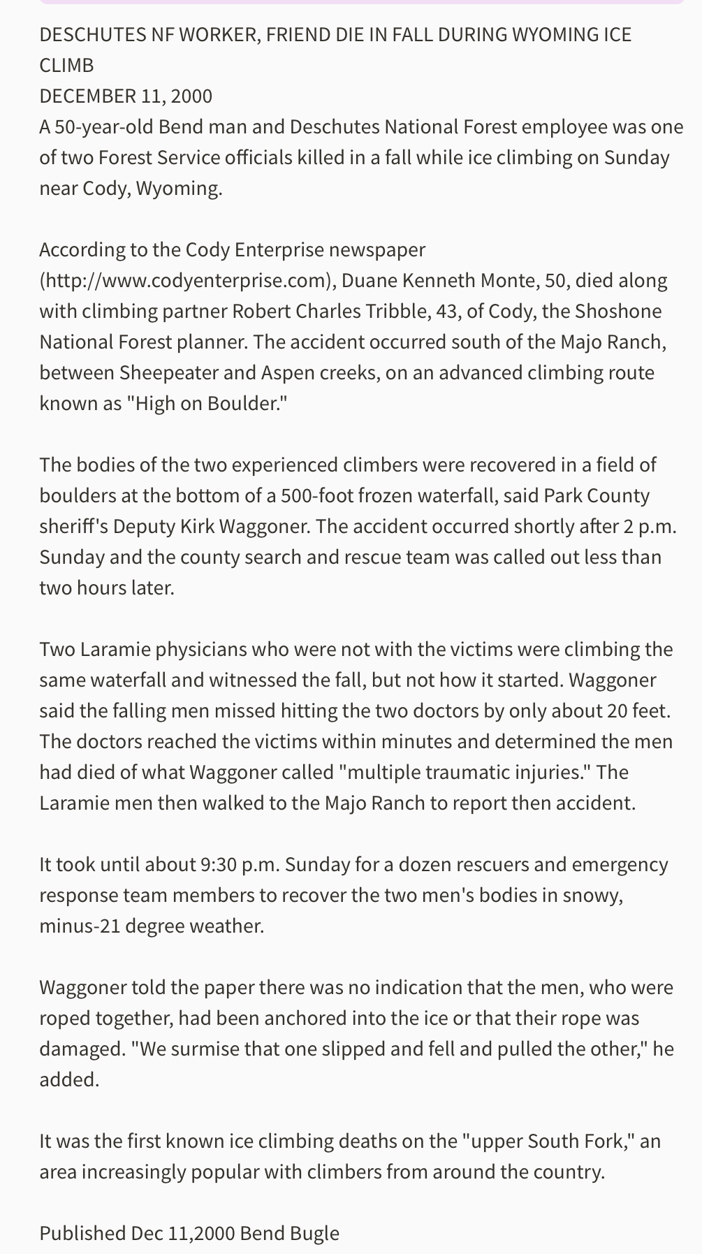 Monte’s early years were spent at Menomonee Falls WI. In 1998 he married Marcy Burks and moved from the Idaho side of the Tetons to Bend OR. On Dec 10, 2001 Duane Monte, age 50, died in an ice climbing accident near Cody WY. He and his partner were roped but apparently not anchored at the time. Their dual fatality fall on the 500 foot waterfall ice formation came within 20 feet of hitting another climbing party.